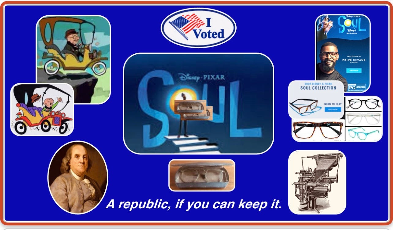 At right in the illustration above, pictured are the actor Jamie Foxx, Disney/Pixar poster film elements from the animated film Soul, and eyeglasses â including two of my three pairs. In the award-winning animated movie, Foxx and Tina Fey voiced the main cartoon characters, each of whom wore distinctive once-nerdy-glasses that have been mega-popular styles ever since.